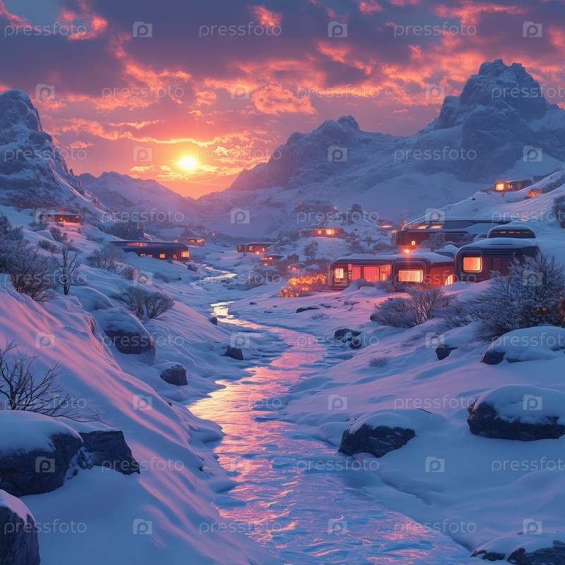 Футуристические дома в заснеженном лесу на закате