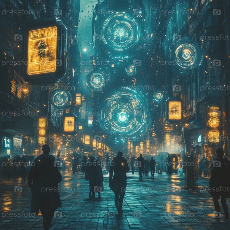 Футуристическая городская улица со светящимися голографическими дисплеями
