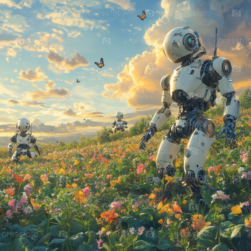 Футуристический робот взаимодействует с бабочками на ярком цветочном поле