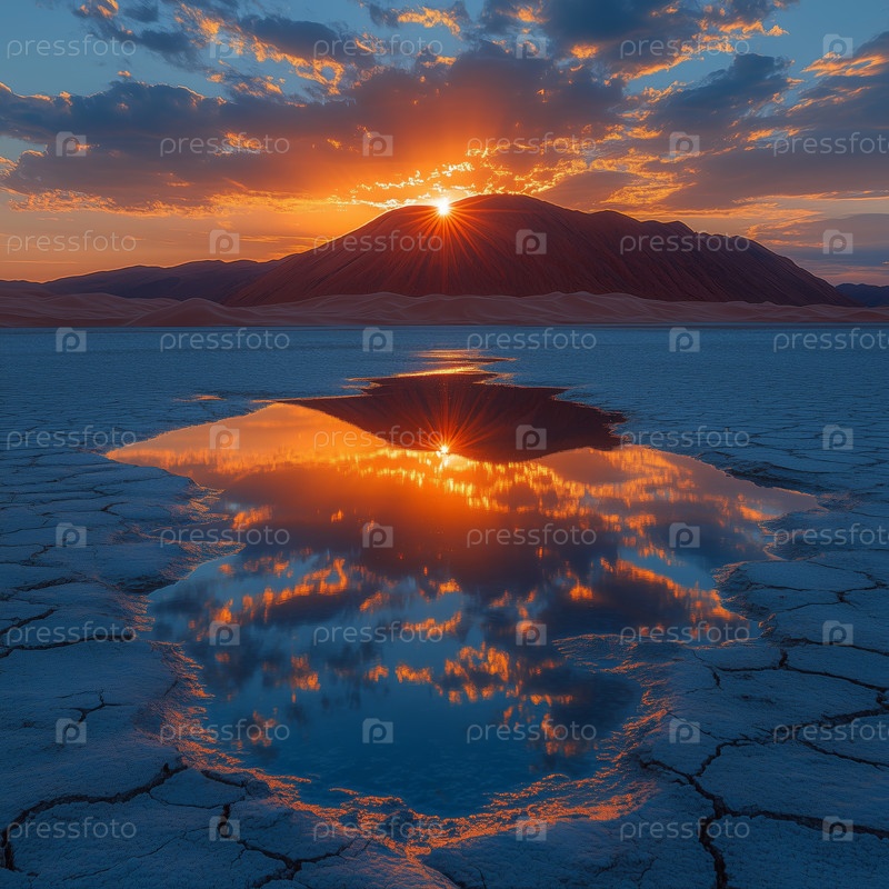 Закат отражается в воде на потрескавшемся пустынном ландшафте