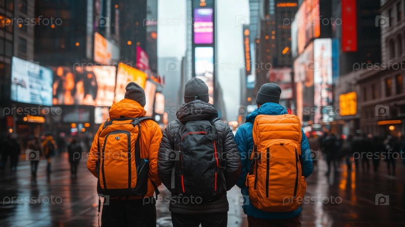 Путешественники с рюкзаками исследуют Таймс-сквер ночью