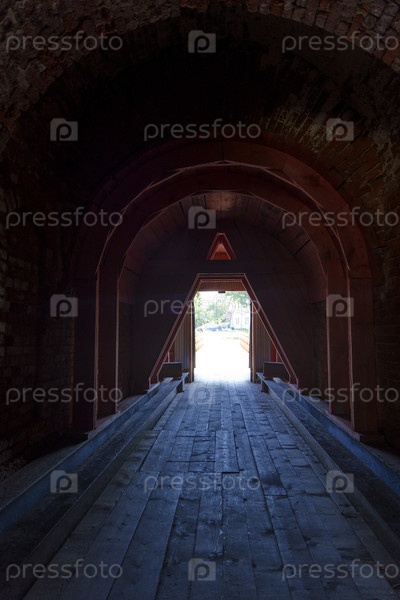 Темный проход через древнюю каменную арку, ведущий к свету