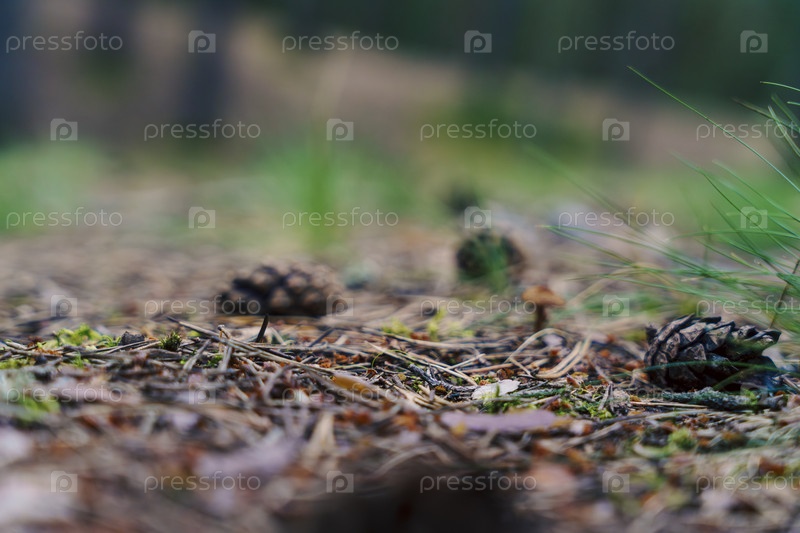 Крупный план сосновых шишек на лесной подстилке с мягким фокусом