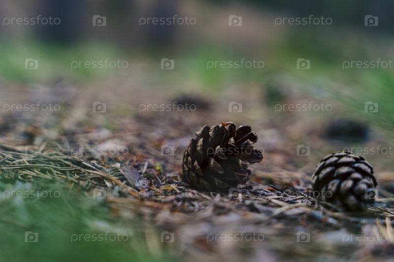 Крупный план сосновых шишек на лесной подстилке с мягким фокусом