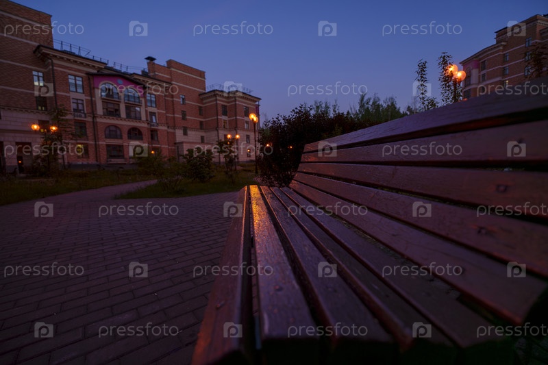 Вечерняя скамейка в парке со светящимися уличными фонарями и жилыми зданиями