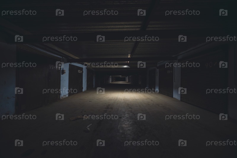 Пустой подземный паркинг с тусклым освещением