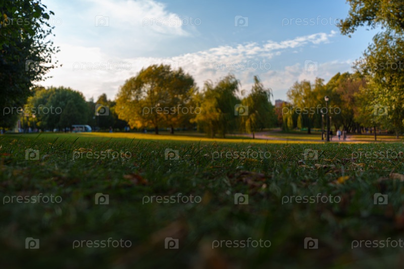 Осенний парк с опавшими листьями и деревьями в теплом солнечном свете