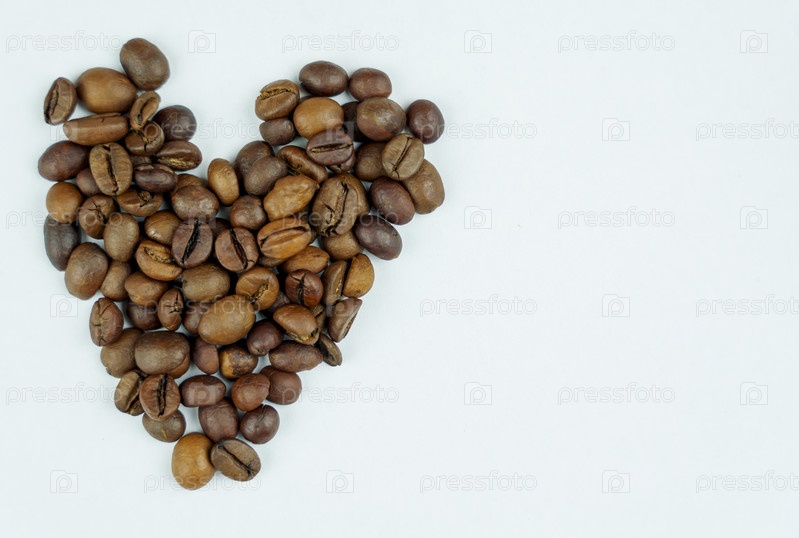 Композиция из кофейных зерен в форме сердца на белом фоне