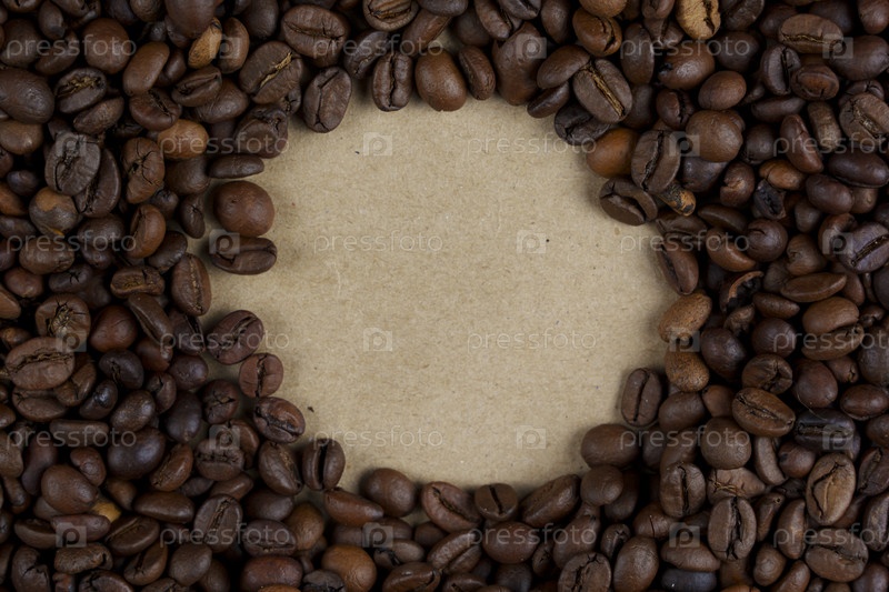 Кофейные зерна, образующие круглую рамку на крафт-бумаге