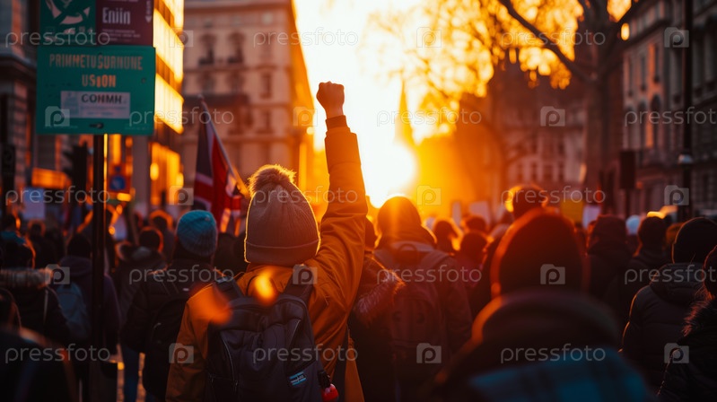 Активисты маршируют на закате с поднятым кулаком