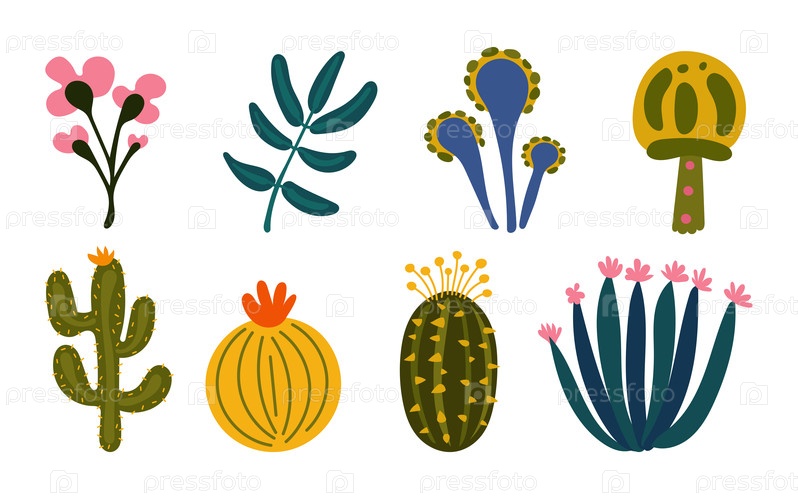 Причудливый набор экзотических доисторических растений, кактусов и фантастических цветов ярких цветов, идеально подходящий для сцен в джунглях, миров динозавров и образовательных плакатов
