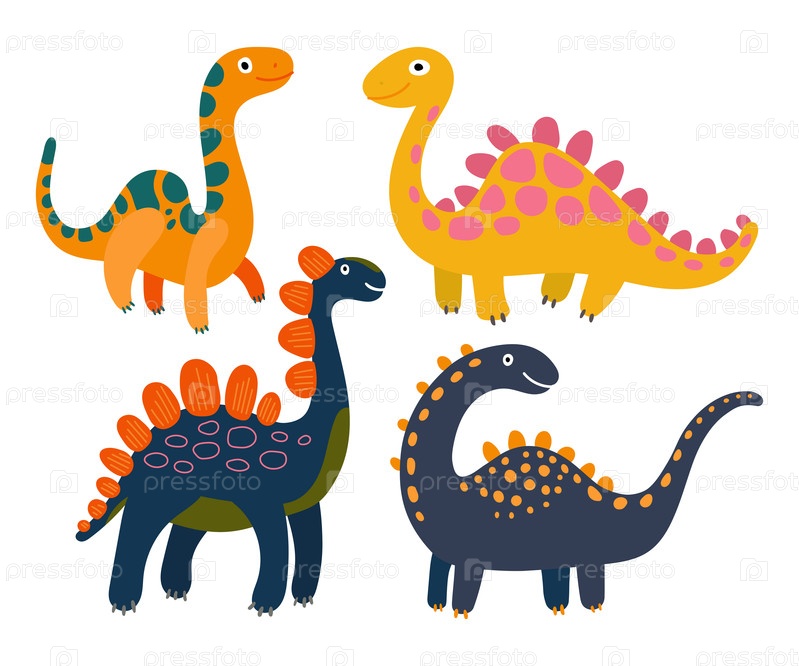 Сгруппированные мультяшные динозавры в веселых позах с яркими оттенками, идеально подходят для образовательных наклеек, плакатов на день рождения и забавных наборов доисторических иллюстраций