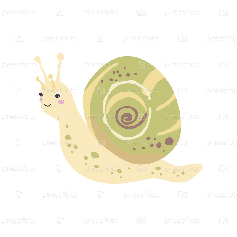 Желтая улитка с закрученной зеленой раковиной и пятнистым телом, идеально подходит для создания милых мультяшных насекомых, садовых иллюстраций и нежных пастельных дизайнов персонажей