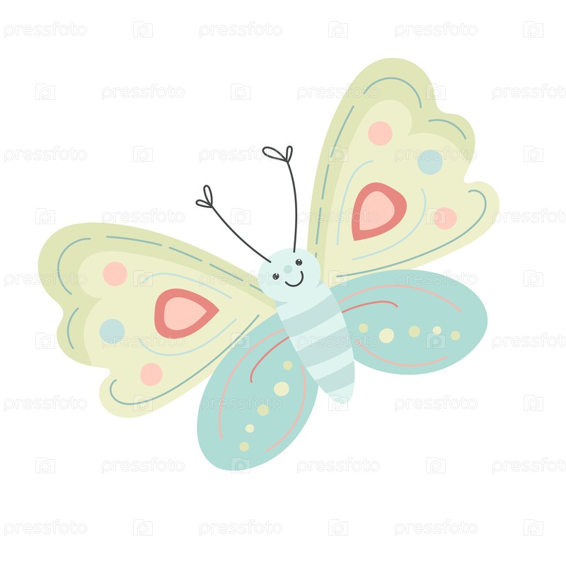 Яркая мятная бабочка с зелеными крылышками и милой улыбкой отлично подойдет для весенних поздравительных открыток, детского декора и легких причудливых узоров