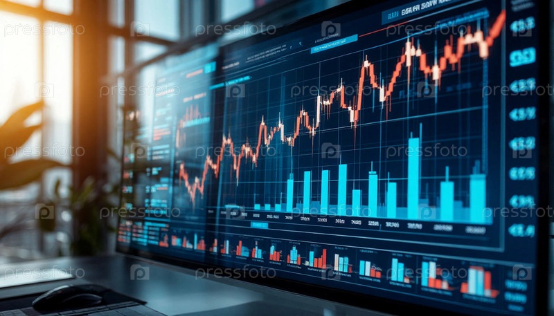 Финансовая панель на ноутбуке, анализирующая данные о продажах и отчет о графике роста, созданный с помощью искусственного интеллекта