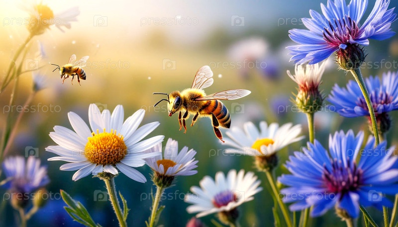 Пчела летит над цветами в солнечный летний день — сгенерировано ИИ