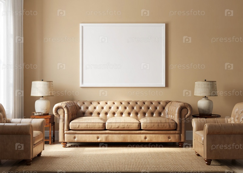 Гостиная в бежевых тонах с кожаным диваном и макетом картины, созданным с помощью искусственного интеллекта