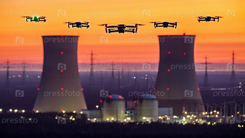 Группа дронов ночью над атомной электростанцией — создано искусственным интеллектом
