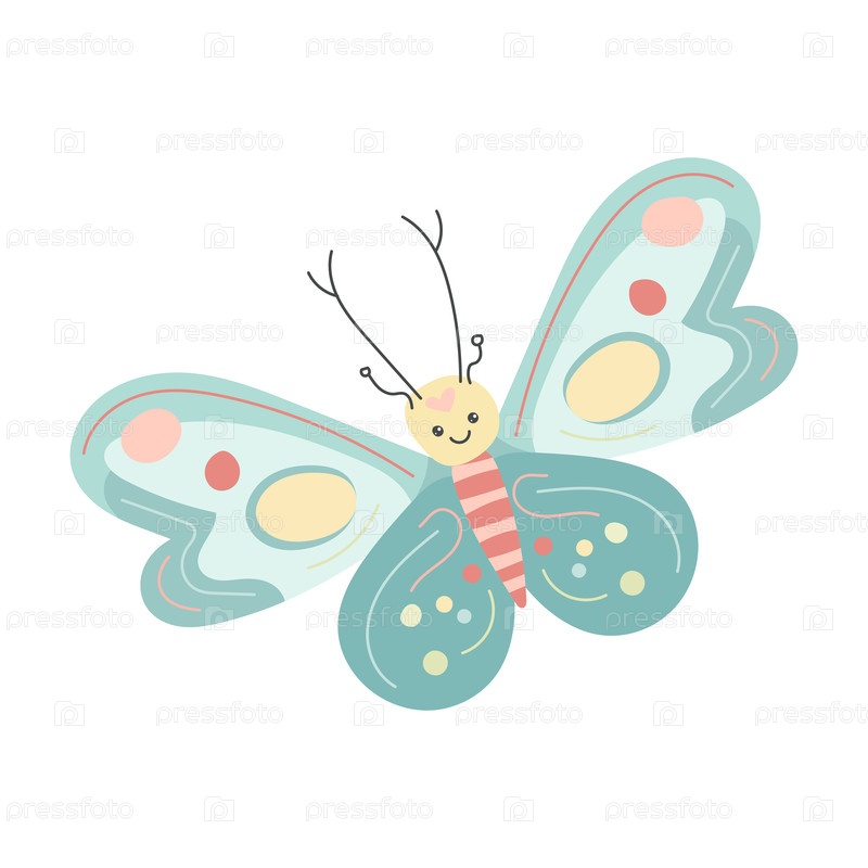 Причудливая бабочка с бирюзовыми крыльями, красными точками и улыбающимся лицом, идеально подходит для иллюстраций весенних насекомых, принтов на природную тематику и веселых дизайнов с летающими насекомыми