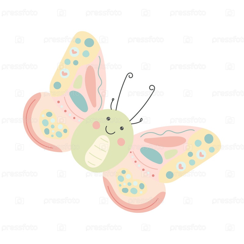 Милая бабочка пастельных тонов с крыльями в виде сердечек и улыбающимся лицом, идеально подходит для весенних открыток, детского декора, детского творчества и дизайна ко Дню святого Валентина