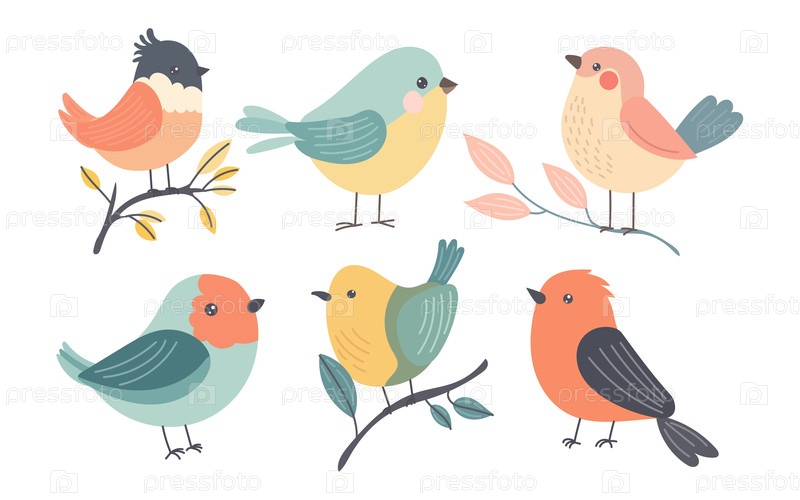 Милые мультяшные птицы, сидящие на ветках с листьями, с красочными перьями, в игривых позах и в мягких пастельных тонах, идеально подходят для иллюстраций весенней дикой природы