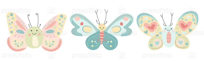 Три бабочки пастельных тонов с веселыми лицами и крыльями, украшенными сердечками, игриво порхают в милой мультяшной иллюстрации, идеально подходящей для весеннего и садового дизайна
