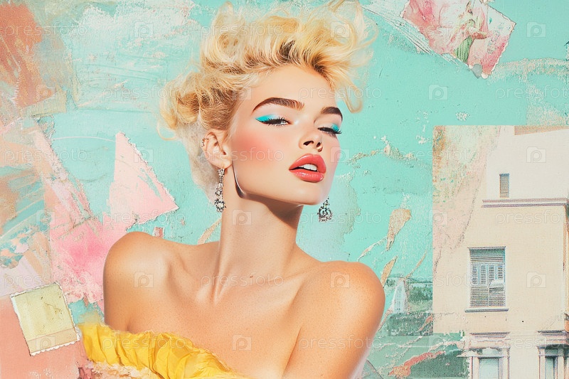 Гламурная блондинка наклоняется вперед с достоинством, демонстрируя винтажный стиль среди художественных пастельных тонов и ностальгических открыток. Ее уверенный взгляд отражает вневременную элегантность