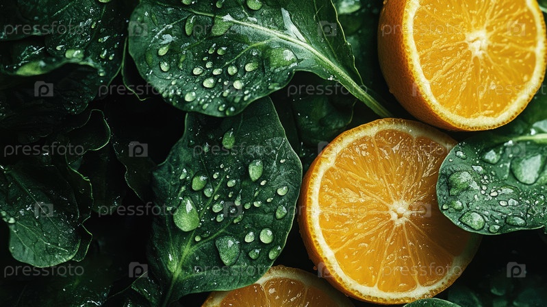 Интимный макроснимок демонстрирует сочные зеленые листья с видимыми каплями в сочетании с яркими дольками цитрусовых, раскрывая сезонную свежесть и богатую текстуру в насыщенном зеленом окружении