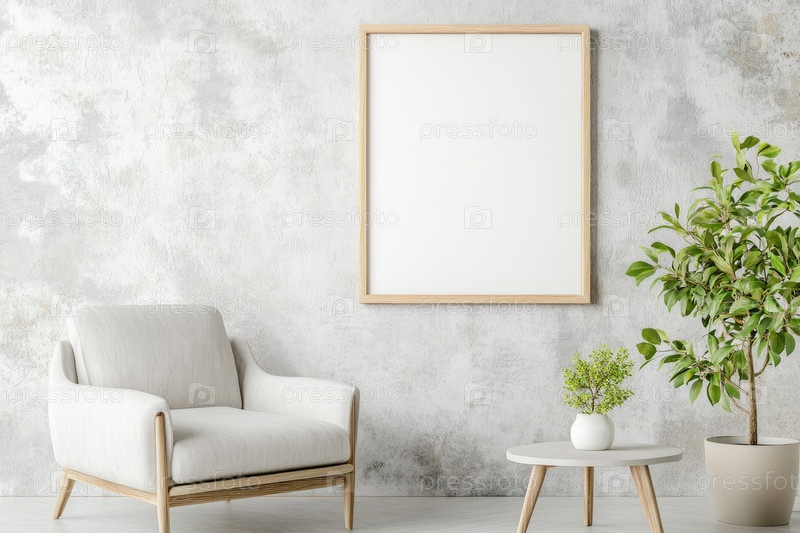 Пустой плакат в деревянной раме висит на фактурной серой стене рядом с современным креслом и небольшим журнальным столиком с растением в горшке, освещенным мягким естественным светом