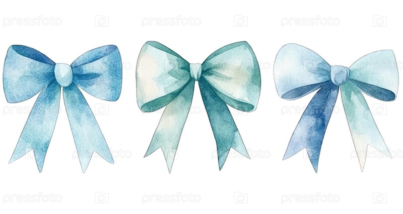 Различные декоративные банты в нежно-голубом акварельном стиле для поделок и дизайнерских проектов