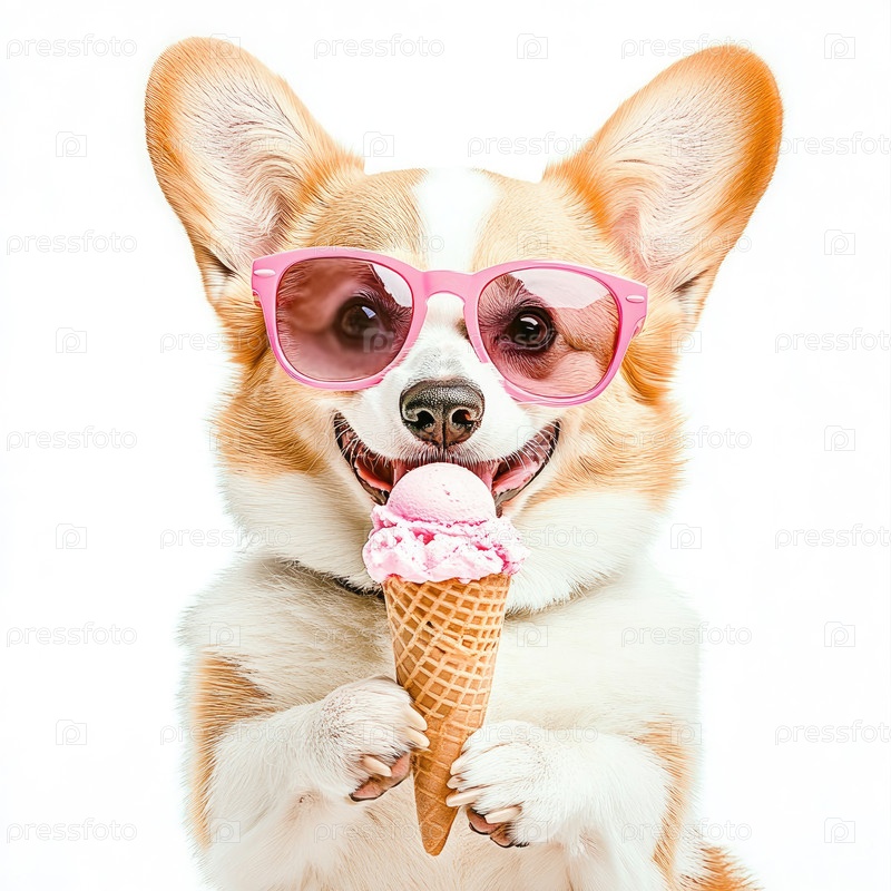 Этот очаровательный корги с большими ушами и веселым выражением лица с удовольствием держит мороженое в стильных солнцезащитных очках. Портрет в полный рост передает его игривый дух