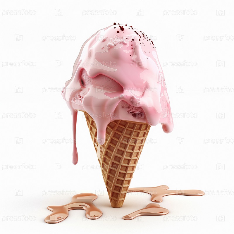 Растаявшее 3d мороженое в вафельном рожке. Сироп, крошки, карамель
