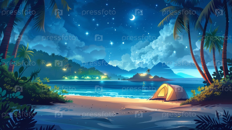 Звездное ночное небо над тропическим пляжем с пальмами