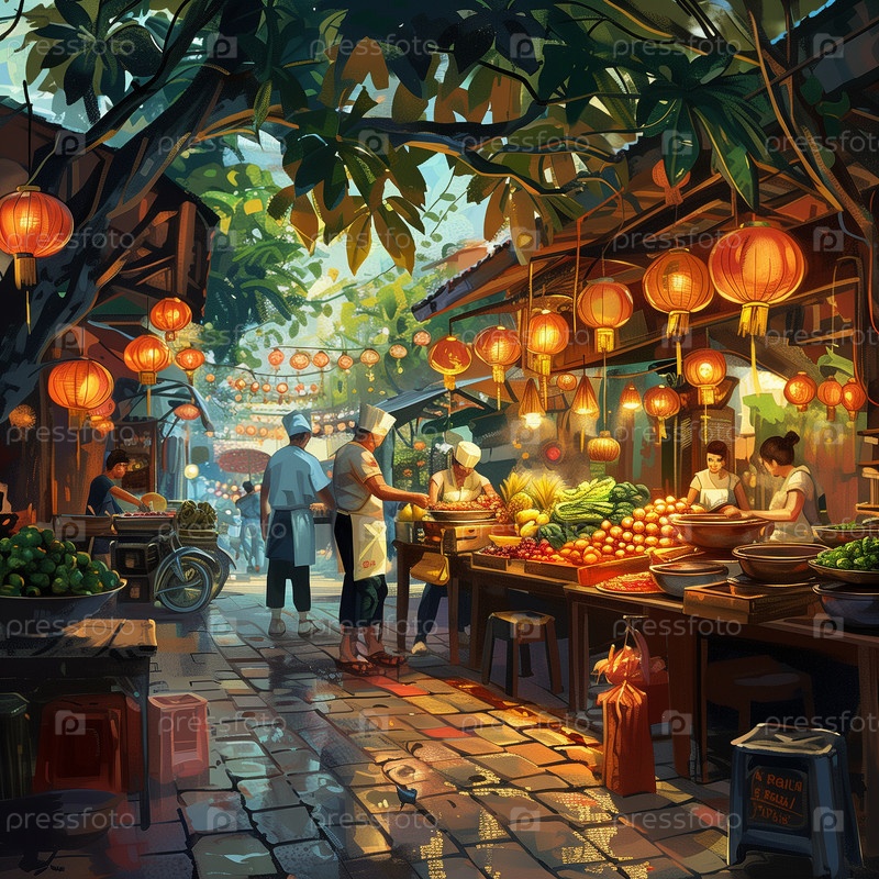 Азиатский рынок уличной еды. Готовка на улице, рынки с едой