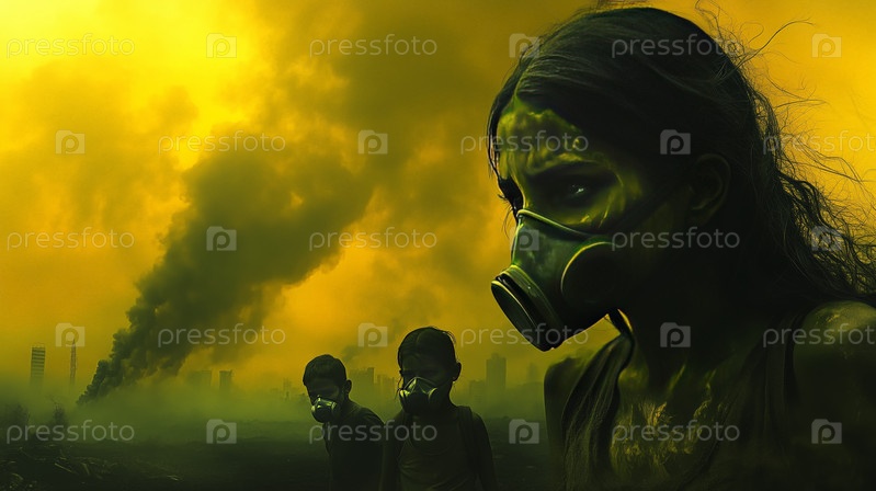 Люди в противогазах среди токсичного дыма и антиутопического пейзажа
