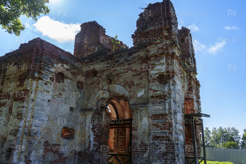 Руины старого кирпичного здания с арочными проемами под голубым небом