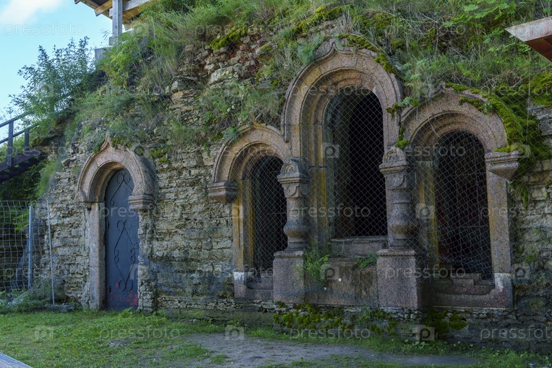 Древний каменный фасад с арочными окнами и мхом в исторической крепости
