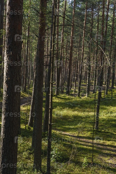Залитая солнцем лесная тропа с соснами в густом лесу