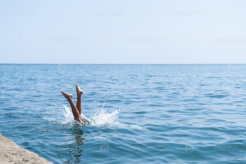 Веселье на берегу моря, ребенок прыгает в воду, ныряет в воду океана. Брызги воды. Пляжные игры