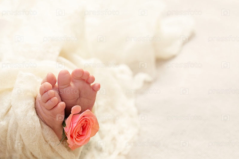 Ноги новорожденного. Новорожденная девочка. Пальцы маленького ребенка с розовым цветком розы. Нежность новой жизни. Копировать пространство