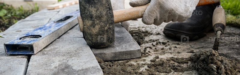 Укладка брусчатки на цементный раствор. Баннер, Укладка садовой дорожки из плитки. Самостоятельная укладка бетонной тротуарной плитки во дворе дома. сделай сам. Сделай сам