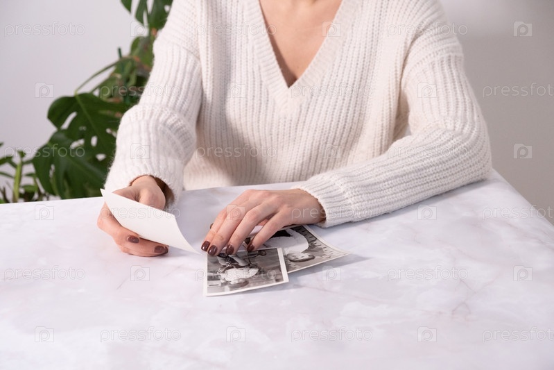 Женщина сидит за столом и смотрит на распечатанные фотографии, вспоминает ностальгию по дню отдыха. фотографии открытки, фон. Макет