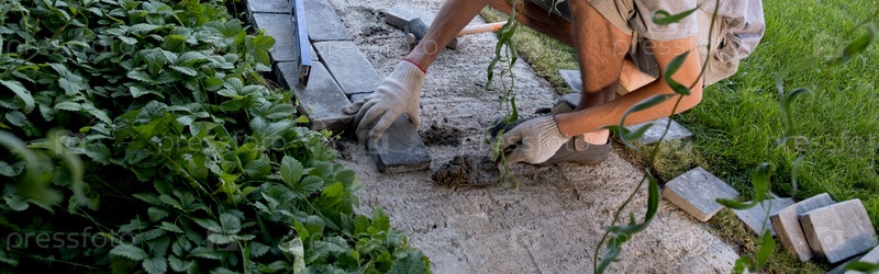 Укладка брусчатки на цементный раствор. баннер, Укладка садовой дорожки из плитки. Самостоятельная укладка бетонной тротуарной плитки во дворе дома. сделай сам. Сделай сам
