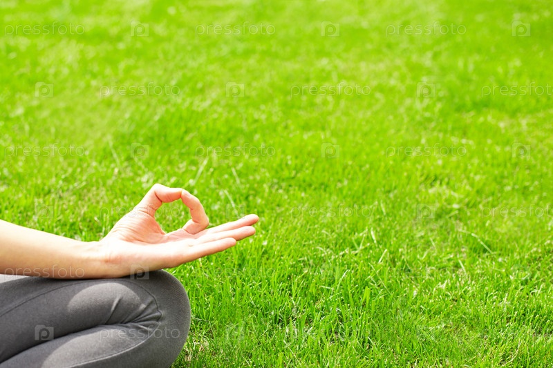 Женщина занимается йогой на траве на открытом воздухе. Копировать пространство
