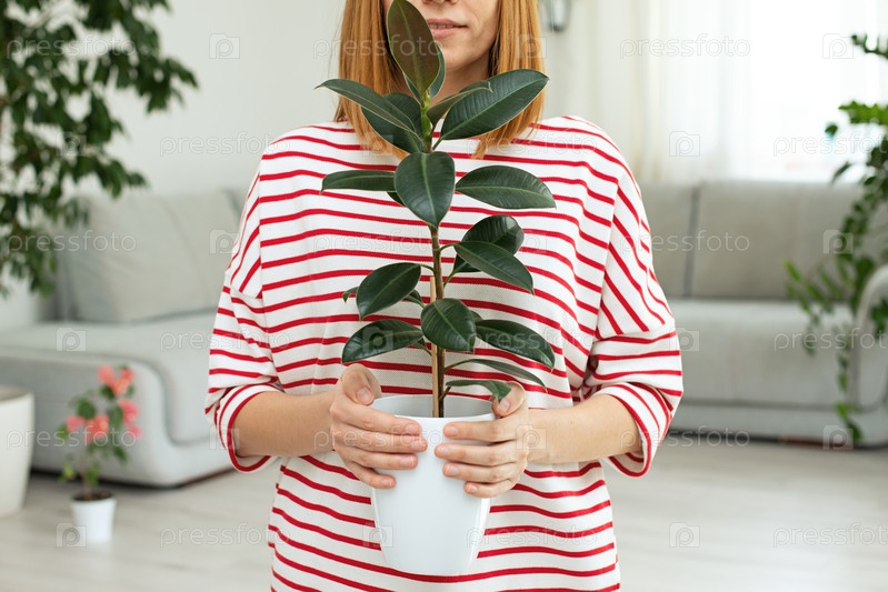 Цветок фикуса в руках девушки. Зеленые листья домашнего растения. копировальное пространство. городские джунгли