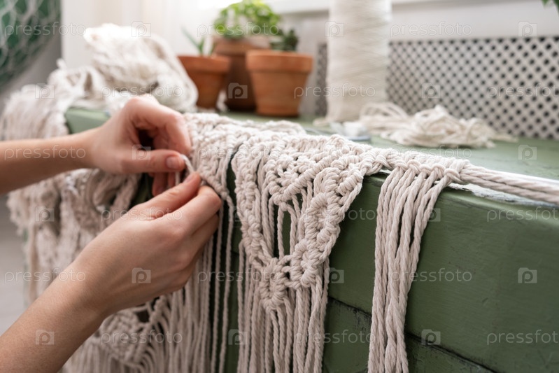Женщина плетет домашний декор своими руками из хлопковых ниток макраме. Процесс создания панно в технике макраме