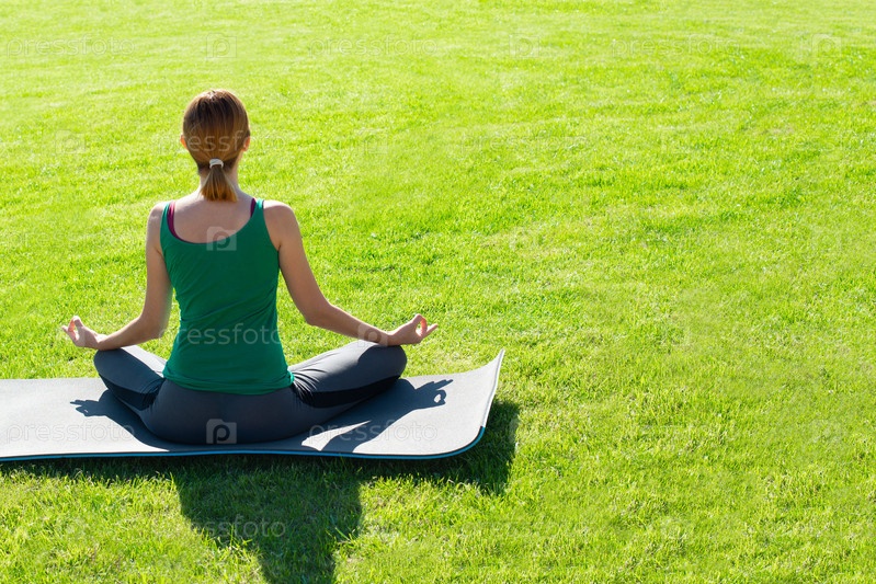 Женщина занимается йогой на траве на открытом воздухе. Копировать пространство