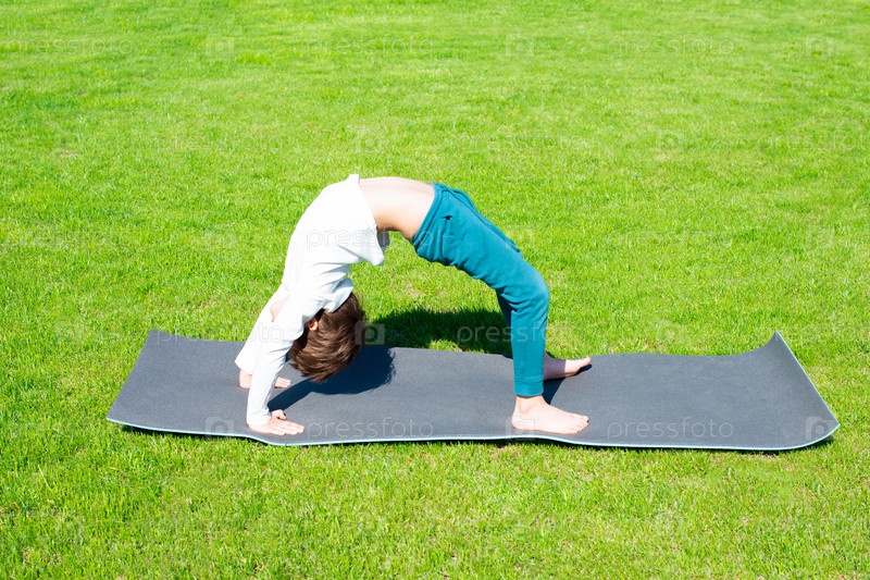 Мальчик занимается йогой на траве. Мероприятия на свежем воздухе для детей