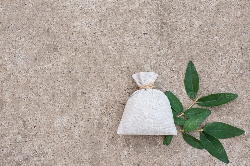 Льняной мешок на бетонном фоне. Место для текста. Мок-ап