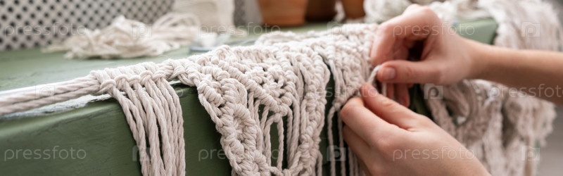 Женщина плетет дом Декор ручной работы из хлопковых ниток макраме. Процесс создания панно макраме. Баннер